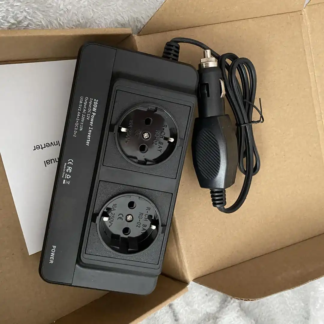 Model: 8300 Weight: 0.5 KG Packaging dimensions: 22*16*6 cm Conversion efficiency: 90.5% Socket type: 2*socket (EU/US) + 4*USB socket Connects to the cigarette lighter Cable length: 60 CM Waveform: Modified sine wave Rated power: 200W Peak power: 400W Input voltage: 12V Output voltage: 110V/220V Output frequency: 50Hz ± 4Hz Warranty: 1 year